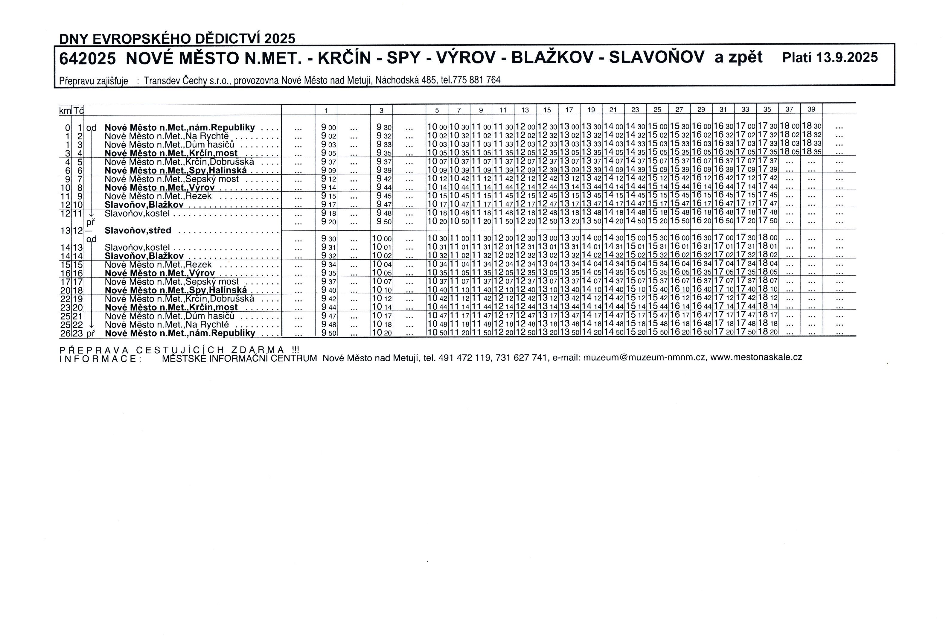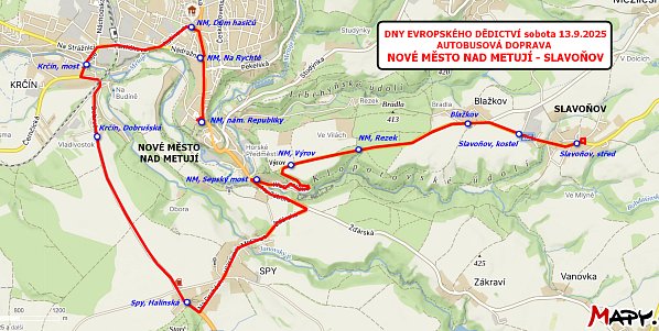 Dopravu zajišťuje pro pořadatele akce Městské muzeum Nové Město nad Metují novoměstská firma Transdev Čechy dvěma vozidly SOR C 10.5 v pravidelných půlhodinových intervalech od 9:00 do 18:00 hod. První autobus přijede do Slavoňova v 9:20 hod. Přeprava cestujících je zdarma.